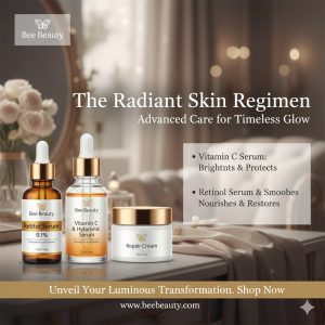 At Bee Beauty, our products are crafted with these principles in mind, to help you achieve that flawless glow naturally. Whether it’s our gentle Retinol Serum that supports cell renewal, our Vitamin C Serum to brighten and even skin tone, or our sunblock that offers reliable protection